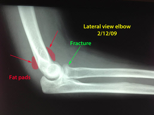 Fig 3: A subtle fracture of the head of the radius bone in the forearm is present (green arrow). The prominent fat pads (red) are usually seen in the setting of the accompanying elbow effusion, which is another indirect sign that a fracture is present.